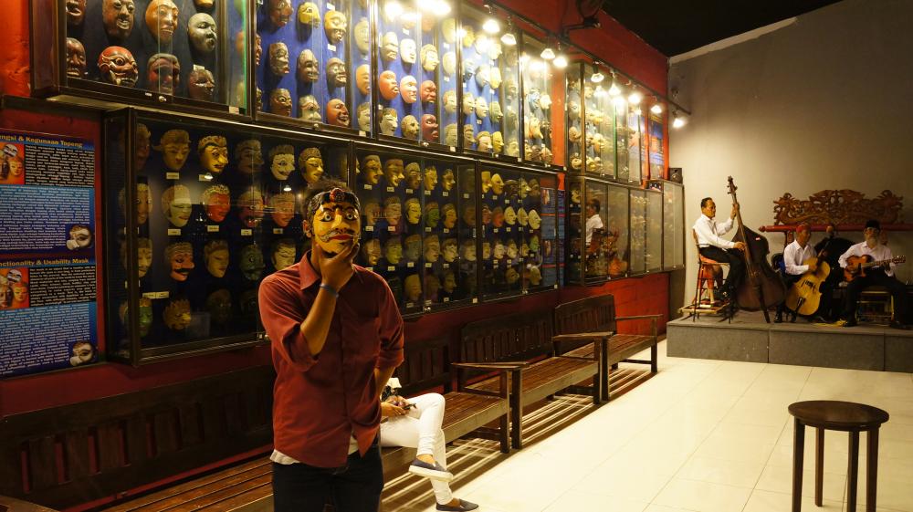 Saat hendak menuju pintu keluar, kalian akan difoto dengan memakai koleksi topeng yang ada di museum.